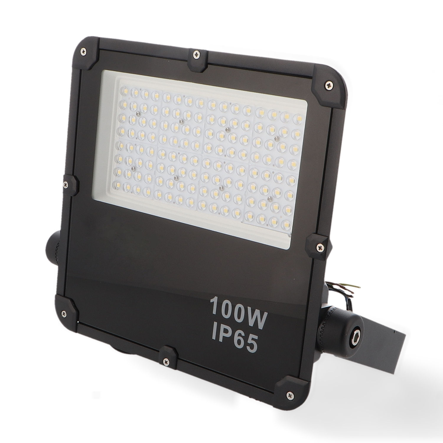 Proyector LED industrial de 100W, alta eficiencia lumínica, ideal para iluminación en exteriores e instalaciones industriales con gran durabilidad y protección IP65.